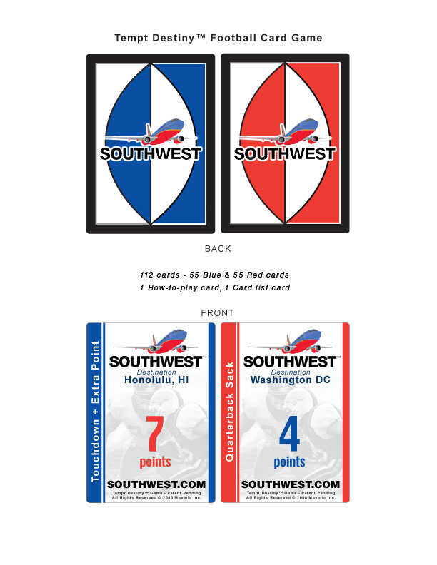 SOLUTION - The patent pending Tempt Destiny card game, licensed by Maveric Inc., enables the fans to interact with the entire sports broadcast, including the commercials, as an extension of "their entertainment" to the benefit of both the fans and the advertisers. Branded Version - We are making arrangements with teams and their sponsors to be featured on exclusively branded Tempt Destiny games for the 2008 football season. With the Tempt Destiny card game, companies that advertise during the televised collegiate and professional football games can now engage the fans with their commercials as part of their entertainment.Companies interested in an exclusive branded edition (see mock-up) or inclusion in the Tempt Destiny game, please contact us via email at: admin@PlayTD.com. To date, the advertisement categories included in the game are: